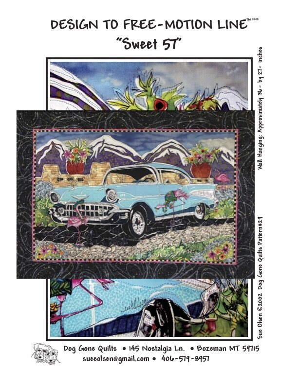 Perfect for the American Classic car collector or aficionado in your life – whether it’s you, a friend, a partner or family member, this 1957 beauty adorned with flamingos and a backdrop of mountains, is a touching memento for anyone’s wall or to use as a centerpiece in a larger project. Sue Olsen of Dog Gone QuiltsTM has drafted a pattern that will result in this heirloom quality, unique wall-hanging quilt. Use your own creativity and vision to make the ‘57 icon an individual art piece that will draw appreciation.
