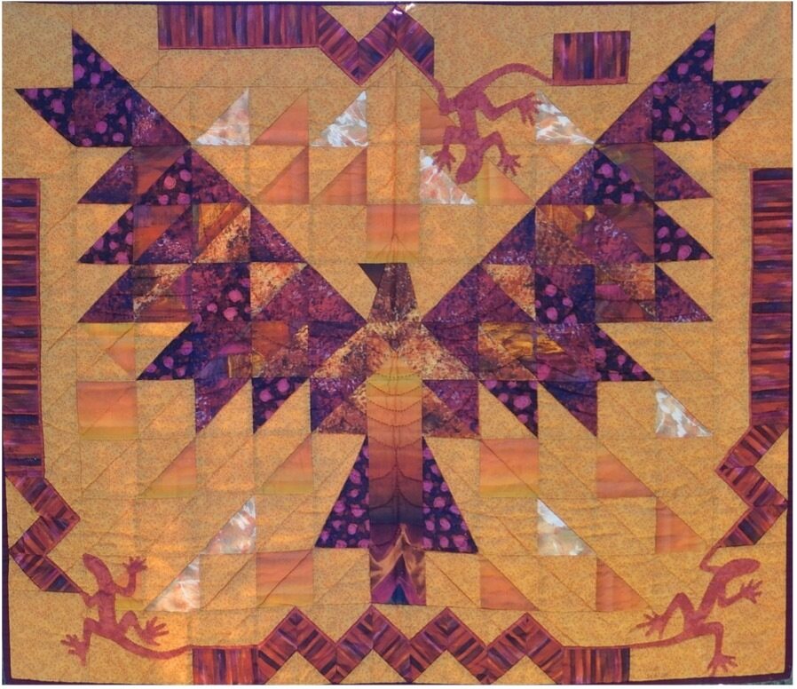The name says it all with this project. Primarily pieced with a few applique accents, this wall-hanging soars to new heights portraying an eagle in southwest tones. Beyond the salute to native people, this graceful bird reflects majesty and pride for all times. Use Southwest tones, or patriotic fabrics, to make this piece your own original piece of textile art.
