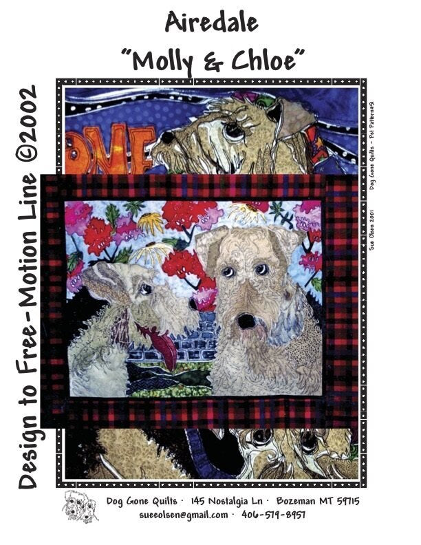 Man’s (or woman’s) best friend has never been captured so realistically and with such color, depth and artistry! Sue Olsen of Dog Gone QuiltsTM has immortalized our canine best friends with fabric in this heirloom quality, unique wall-hanging quilt. Use your own creativity and vision to make Molly and Chloe, the Airedales, your very own.