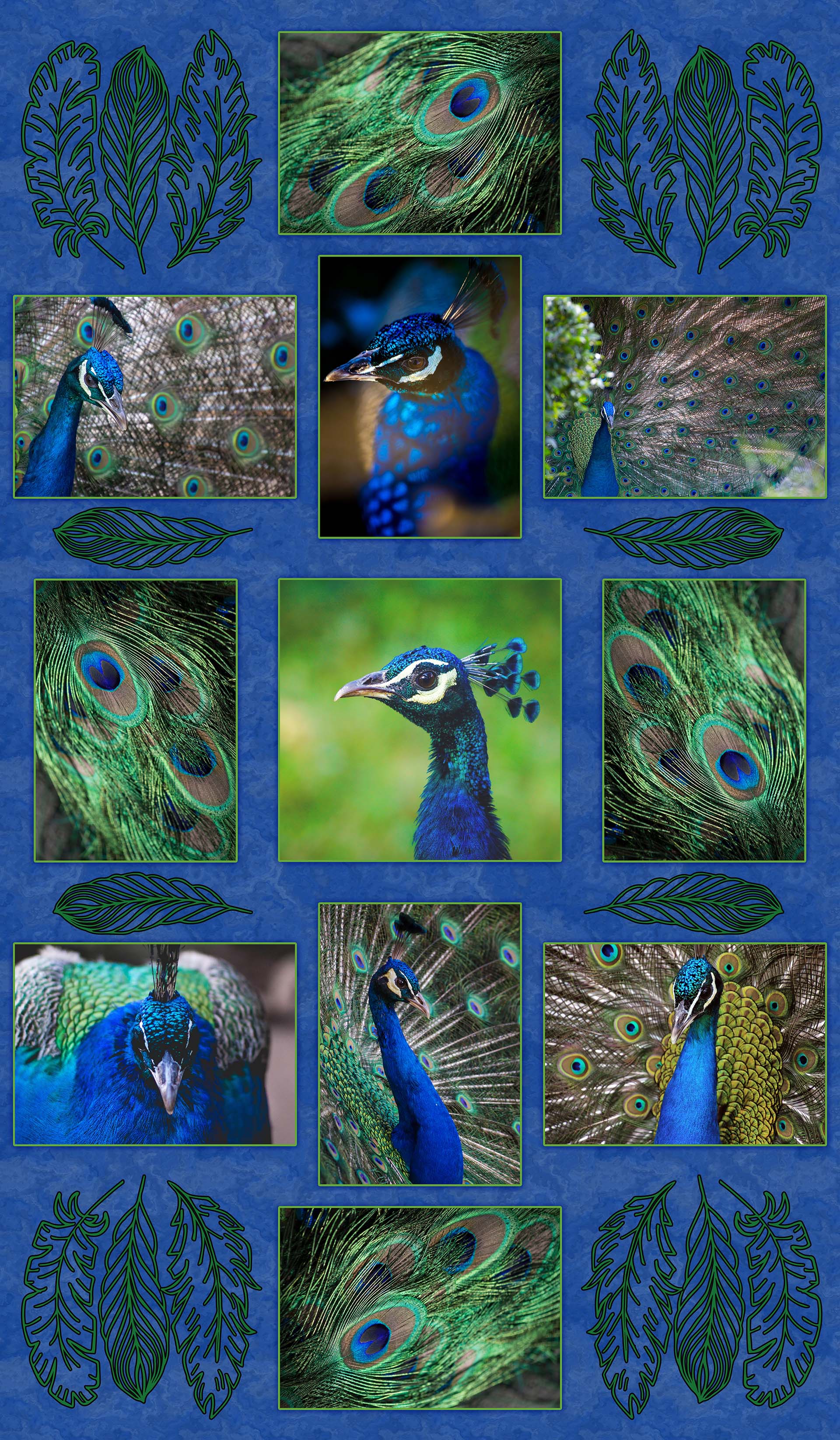 This dramatic and colorful collage of peacock images is complimented by the addition of graphic feathers, perfect for stitching. This large panel measures 21.375" wide by 34.75" tall and will make a great wall hanging or centerpiece for your next quilt project. Digitally printed on high quality 100% cotton fabric.
