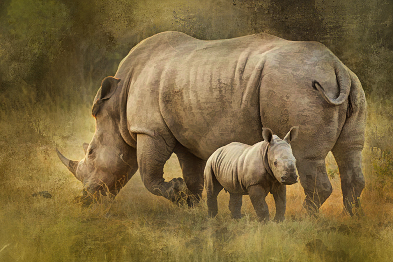 The incredible size difference between mother and baby rhino depicted here highlights the fragility of this endangered species. Printed on high quality quilting cotton, panel size is 18” wide and 12” tall.