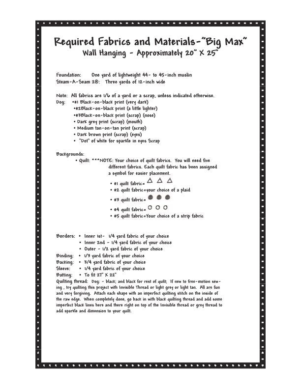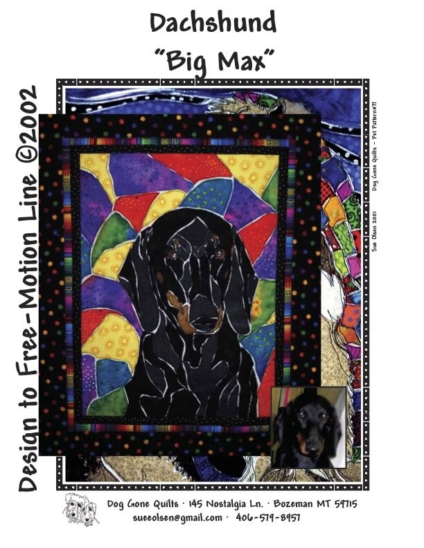 Man’s (or woman’s) best friend has never been captured so realistically and with such color, depth and artistry! Sue Olsen of Dog Gone QuiltsTM has immortalized our canine best friends with fabric in this heirloom quality, unique wall-hanging quilt. Use your own creativity and vision to make Big Max, the Dachshund, your very own.