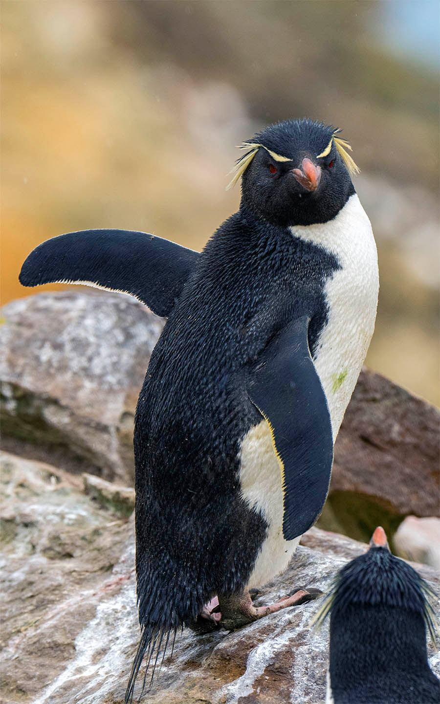 Rock Hopper Penguin – This little Rock Hopper Penguin is proudly posing for the camera in the Falkland Islands. They are one of the funniest penguin species to observe with their mohawk and red eyes. Size is 10" x 15.75". Panel is printed on high quality quilting cotton, is colorfast and washable.