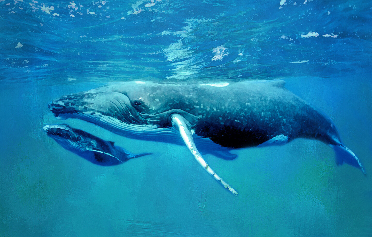 This massive gray whale with her calf by her side could very well be making their way back to Alaska from Baja…along the Pacific coast of California. Panel size is 22” wide by 14” tall. Digitally printed on high quality quilting cotton, panel is washable and color fast.