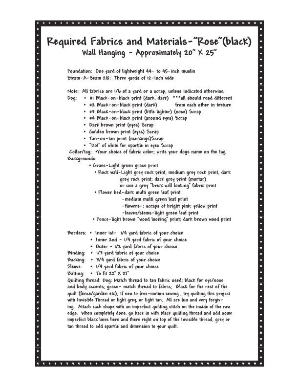 Man’s (or woman’s) best friend has never been captured so realistically and with such color, depth and artistry! Sue Olsen of Dog Gone QuiltsTM has immortalized our canine best friends with fabric in this heirloom quality, unique wall-hanging quilt. Use your own creativity and vision to make Rose, the Doberman, your very own.