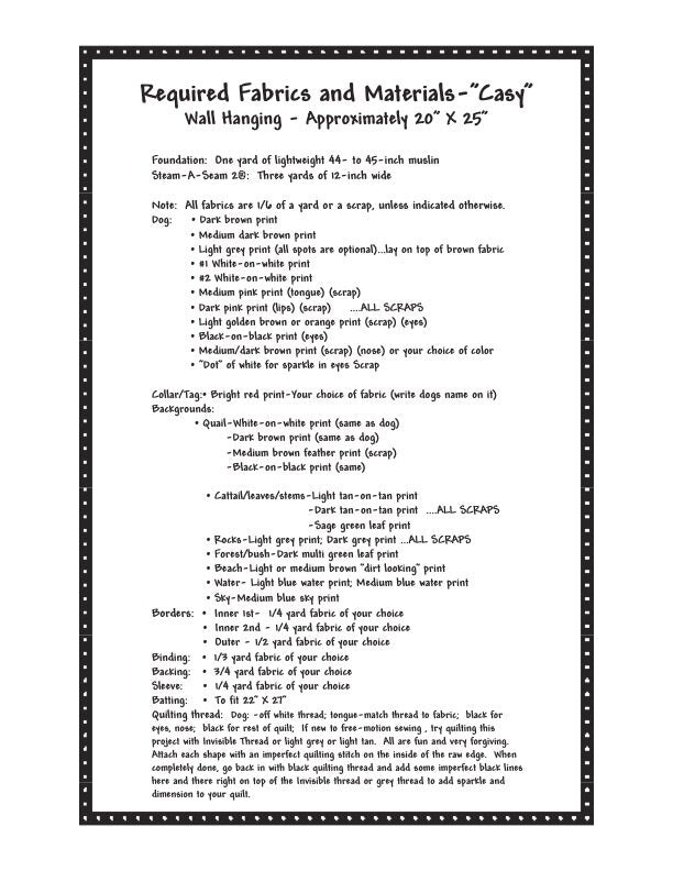 Man’s (or woman’s) best friend has never been captured so realistically and with such color, depth and artistry! Sue Olsen of Dog Gone QuiltsTM has immortalized our canine best friends with fabric in this heirloom quality, unique wall-hanging quilt. Use your own creativity and vision to make Casy, the German Shorthaired Pointer, your very own.