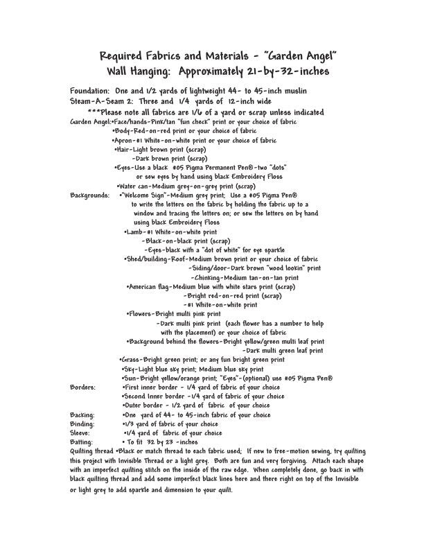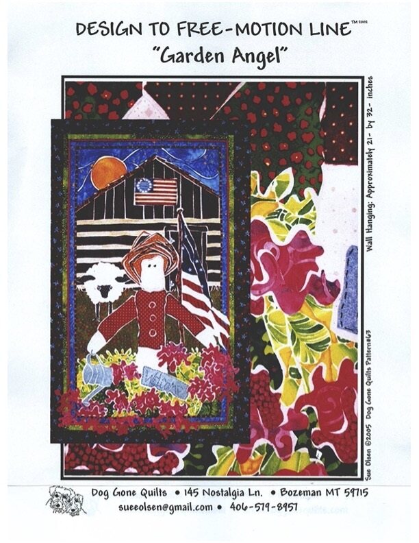 Not a scarecrow or gnome, this Garden Angel is an original creation! Sue Olsen of Dog Gone QuiltsTM has created this unique wall-hanging which you can customize with your own creativity and vision. The barn, flag, flowers and sheep surround a good luck angel watching over the garden.
