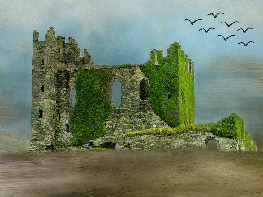 This fantasy image was composed from a photograph of an Irish castle, placed on a seaside beach as though it is washing away. Panel is digitally printed on high quality quilting cotton, measures 24”X18”, is washable and colorfast. Very fun to create.