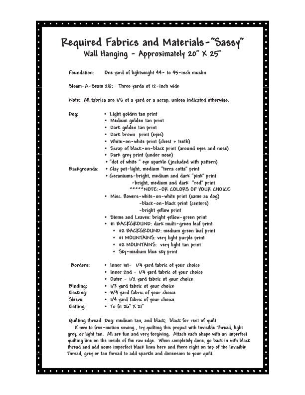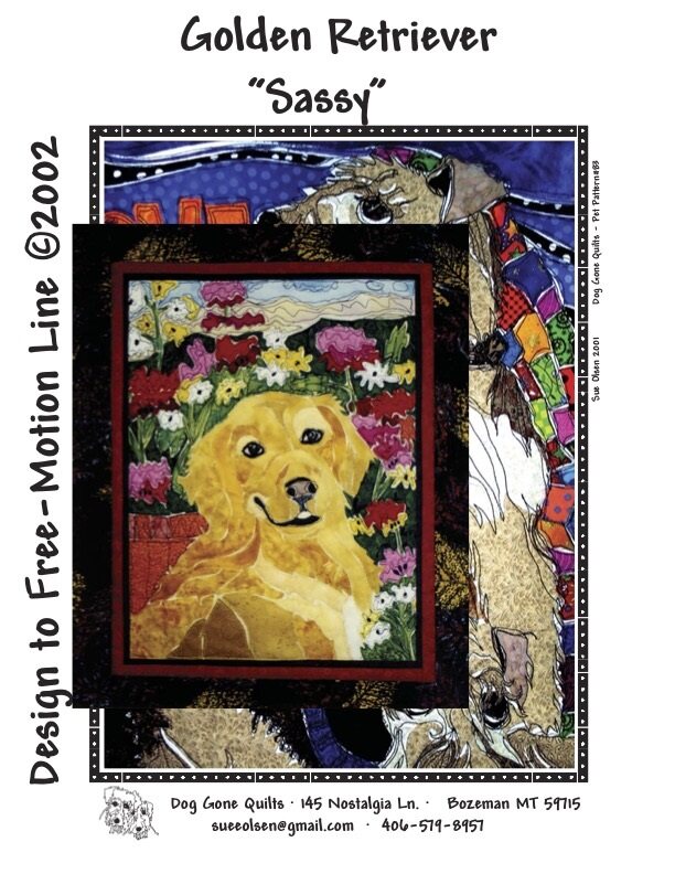 Man’s (or woman’s) best friend has never been captured so realistically and with such color, depth and artistry! Sue Olsen of Dog Gone QuiltsTM has immortalized our canine best friends with fabric in this heirloom quality, unique wall-hanging quilt. Use your own creativity and vision to make Sassy, the Golden Retriever, your very own.