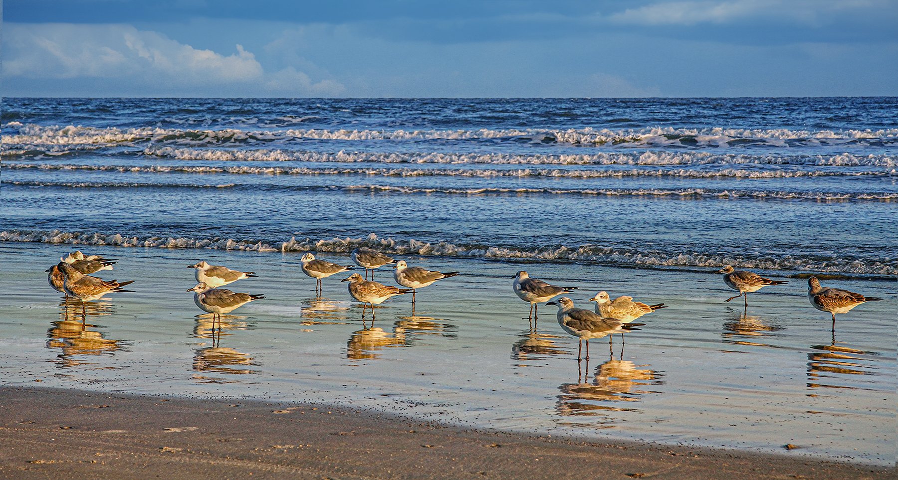 Though researchers have yet to conclusively explain the phenomenon, flocks of seagulls often move in unison. This panel captures this moment of unity, measuring 24”x13” on quality quilting cotton and being washable and colorfast.