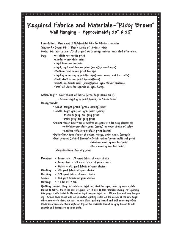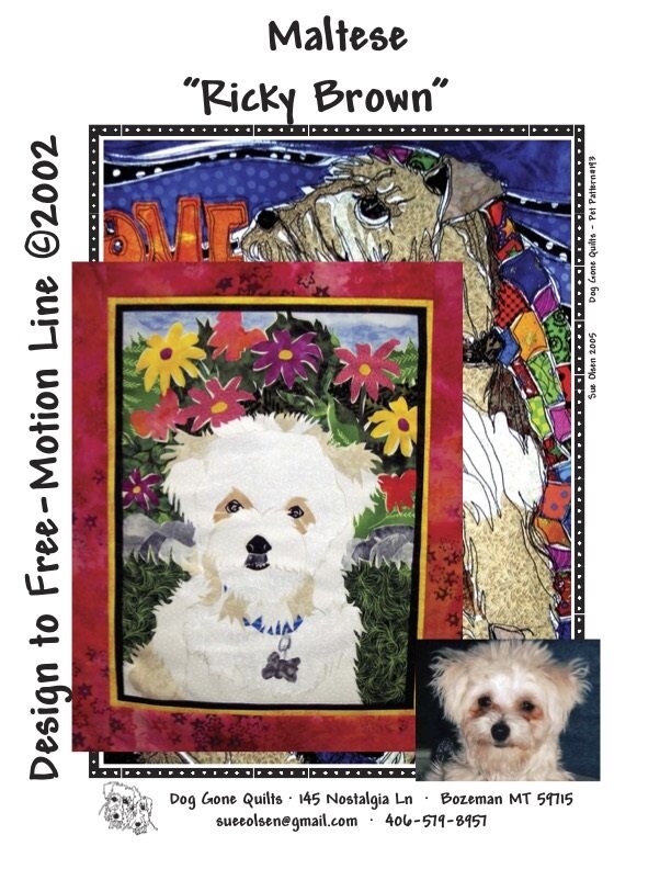 Man’s (or woman’s) best friend has never been captured so realistically and with such color, depth and artistry! Sue Olsen of Dog Gone QuiltsTM has immortalized our canine best friends with fabric in this heirloom quality, unique wall-hanging quilt. Use your own creativity and vision to make Rickie Brown, the Maltese, your very own.