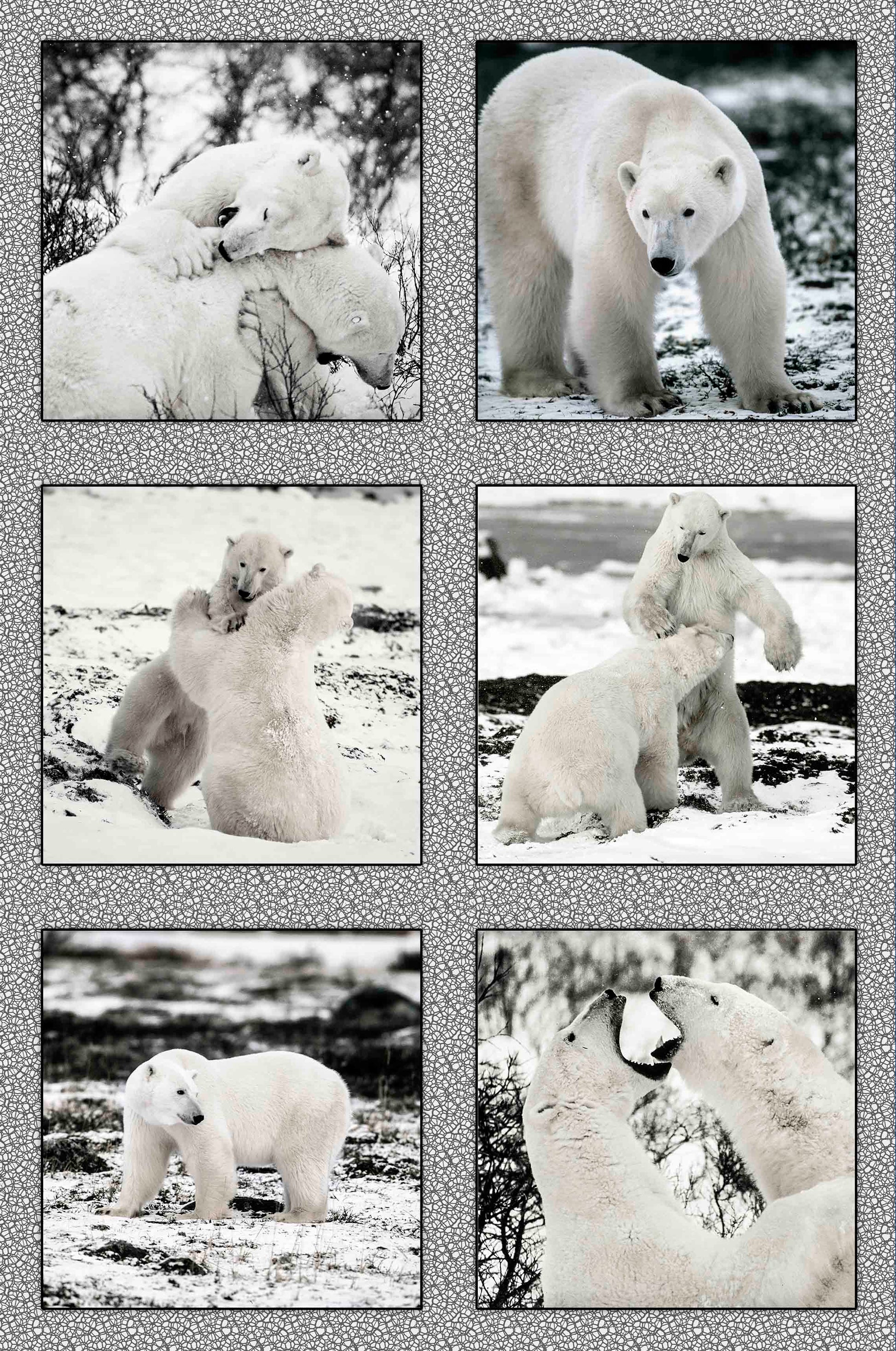 These vintage black and white images of polar bears depict their playful side. Panel size is 16” wide and 25.25” tall. Digitally printed on high quality 100% cotton quilt fabric.
