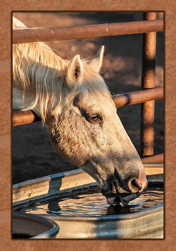 Love the late afternoon light on both this horse's face and on the water in his trough. Panel is printed on high quality quilting cotton. Washable and colorfast. Panel size is 9.88"X14.25"