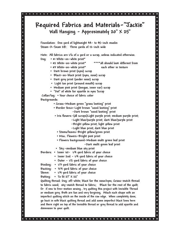 Man’s (or woman’s) best friend has never been captured so realistically and with such color, depth and artistry! Sue Olsen of Dog Gone QuiltsTM has immortalized our canine best friends with fabric in this heirloom quality, unique wall-hanging quilt. Use your own creativity and vision to make Jackie, the West Highland Terrier, your very own.