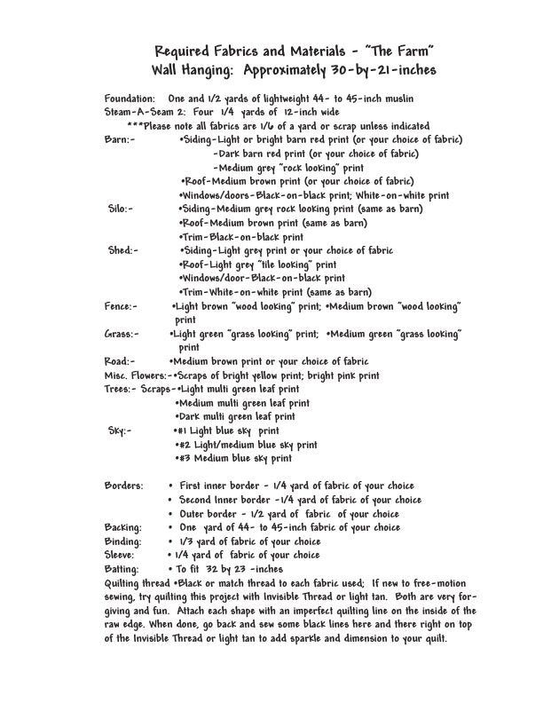 This is the opportunity to reflect real life - stitch a farm that is a fabric replica of the family homestead, or favorite country scene. Choose Winter, Spring, Summer or Fall grass fields, leave the evergreens empty or heavy with snow, color the barn and choose fabric with texture in this heirloom quality, unique wall-hanging quilt. Let loose your muse and frame this fiber masterpiece signed by you.