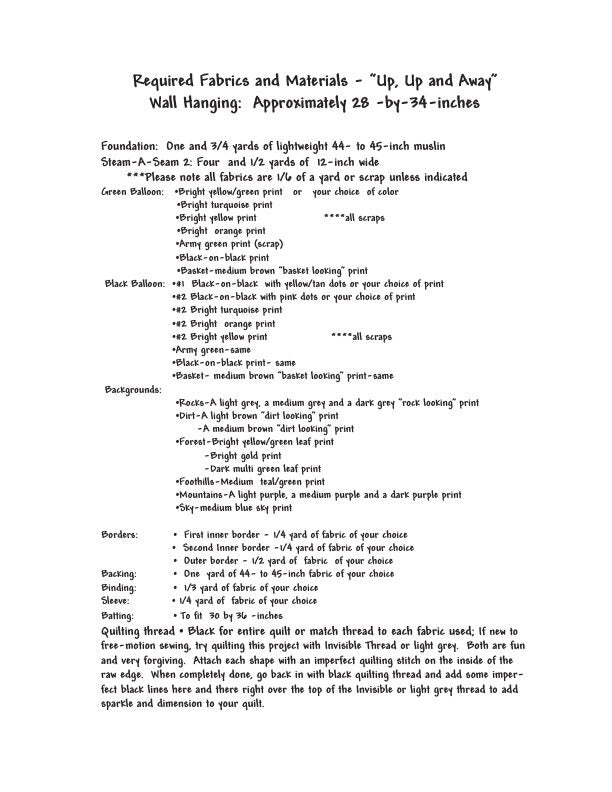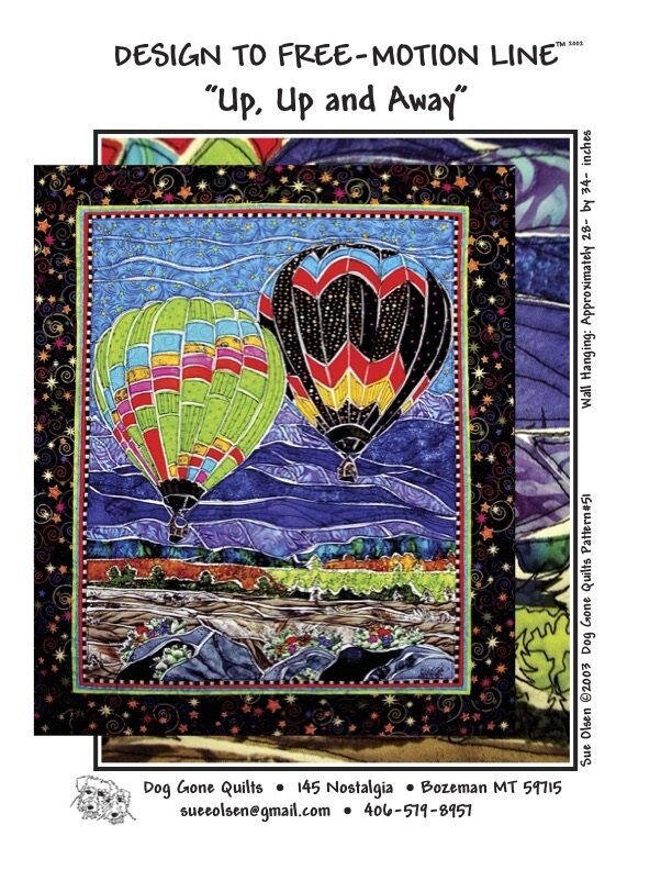 Where do you want to soar above in a hot air balloon? Purple mountains and a lush landscape spread below this pair of colorful hot air balloons designed by Sue Olsen of Dog Gone QuiltsTM. Make your imagination come to life with fabric in this heirloom quality, unique wall-hanging quilt. Color the balloons and re-create the landscape below to make this hot air adventure a reflection of your own imagination or remembrance.