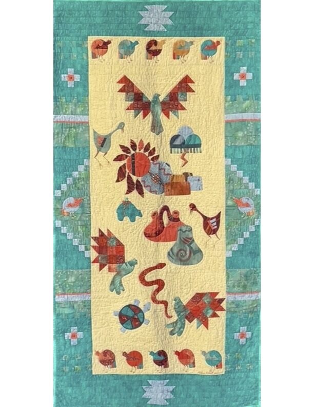 Another project where you get to try your hand at numerous symbols of the Southwest – pottery, roadrunners, snakes, and even a turtle! The pieced border embraces the Southwest symbology. Plenty of opportunity to play with color, scale and technique in this striking compilation of Southwest imagery. Make it for yourself or as a gift – or make multiple – the perfect wall-hanging for your Southwest home.