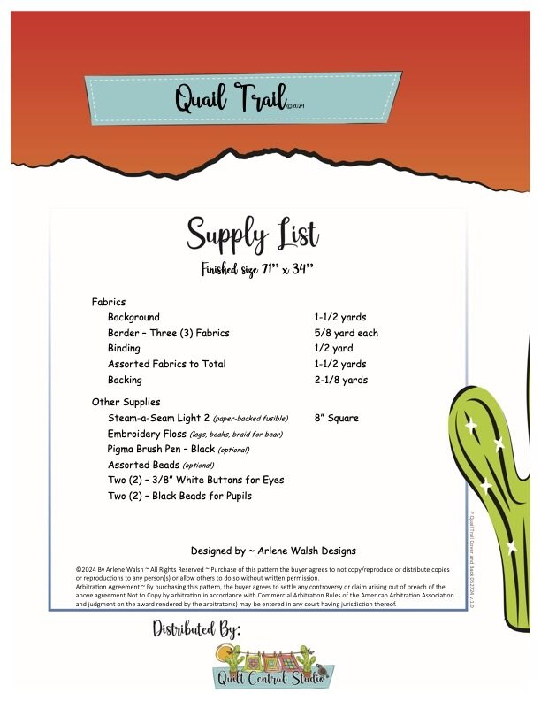 Quail Trail Quilt Pattern - An Arlene Walsh Design, Southwest Pattern, Fused Applique