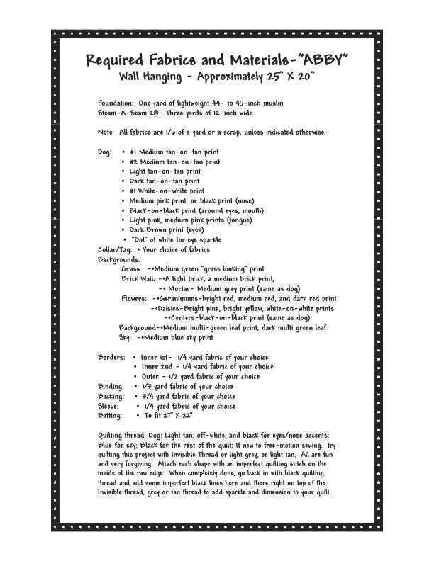 Sitting perfectly on a green lawn in front of a brick wall and set amongst bright daisies and other flowers man’s (or woman’s) best friend has never been captured so realistically and with such color, depth and artistry! Sue Olsen of Dog Gone QuiltsTM has immortalized our canine best friends with fabric in this heirloom quality, unique wall-hanging quilt. Use your own creativity and vision to make Abby, Golden Retriever, your very own.
