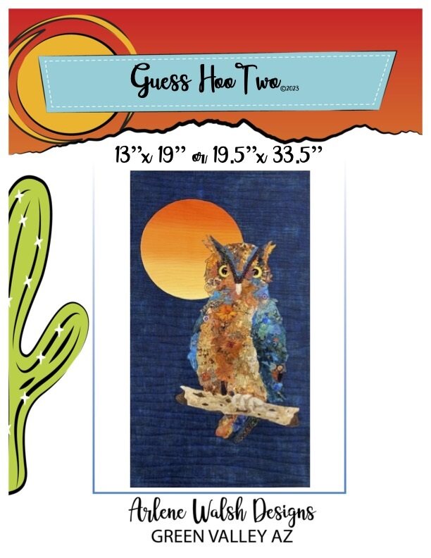 Select the size you want to make – or make both for double the fun! This wide-eyed owl invites a colorful pelt of feathers and striking expression. Guess Hoo will take you to the next step in collage building by utilizing even smaller fabric pieces to create your unique art quilt. The wide body of the owl allows you to practice value and flow techniques. Collage is like eating potato chips as you add fabric you get excited to find the next perfect piece. Unlike most raw edge applique, this process uses a glue product to baste the fabric in place until stitching. Fast and Fun, Fun, Fun!