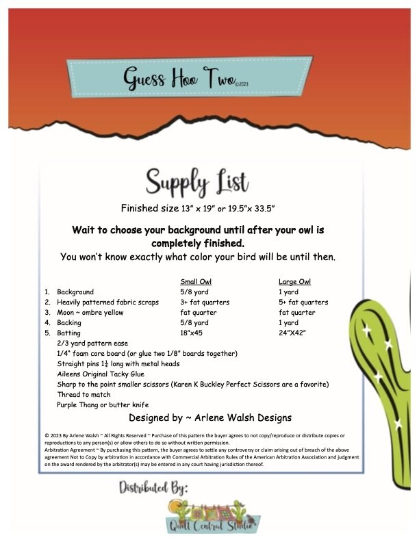 Guess Hoo Two Quilt Fabric Kit and Pattern - An Arlene Walsh Design, Southwest Pattern, Fused Applique