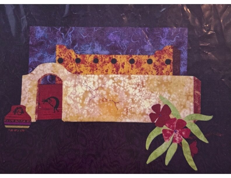 Simple and striking, this adobe is reminiscent of New Mexico adobe homes. Use this pattern as the starting point to build your own ‘home’ in fabric. Easy to follow applique techniques and few fabrics allow you to embellish and personalize your own work of art.