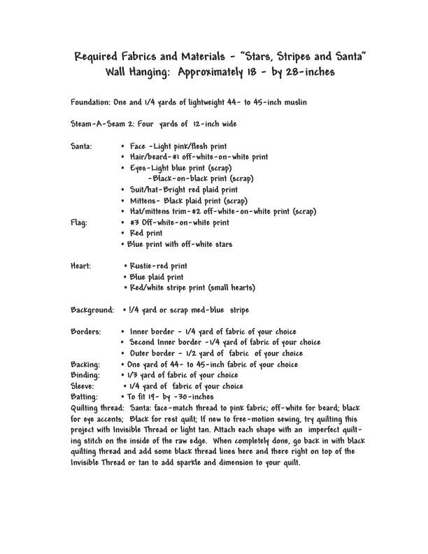 If you cannot make up your mind or want a single wall-hanging that can hang for twelve months, this project is for you! Sue Olsen of Dog Gone QuiltsTM has combined nostalgic images in this heirloom quality, unique wall-hanging quilt. Santa holding an American flag and heart can grace your wall all year long. Make this project a one-of-a-kind artwork with your vision and creativity.